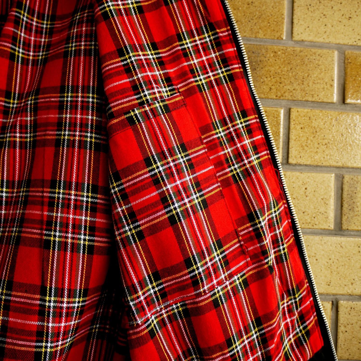 窮屈すぎないリブ周り、赤色を基調としたタータンチェックの裏地が仕様となっています。