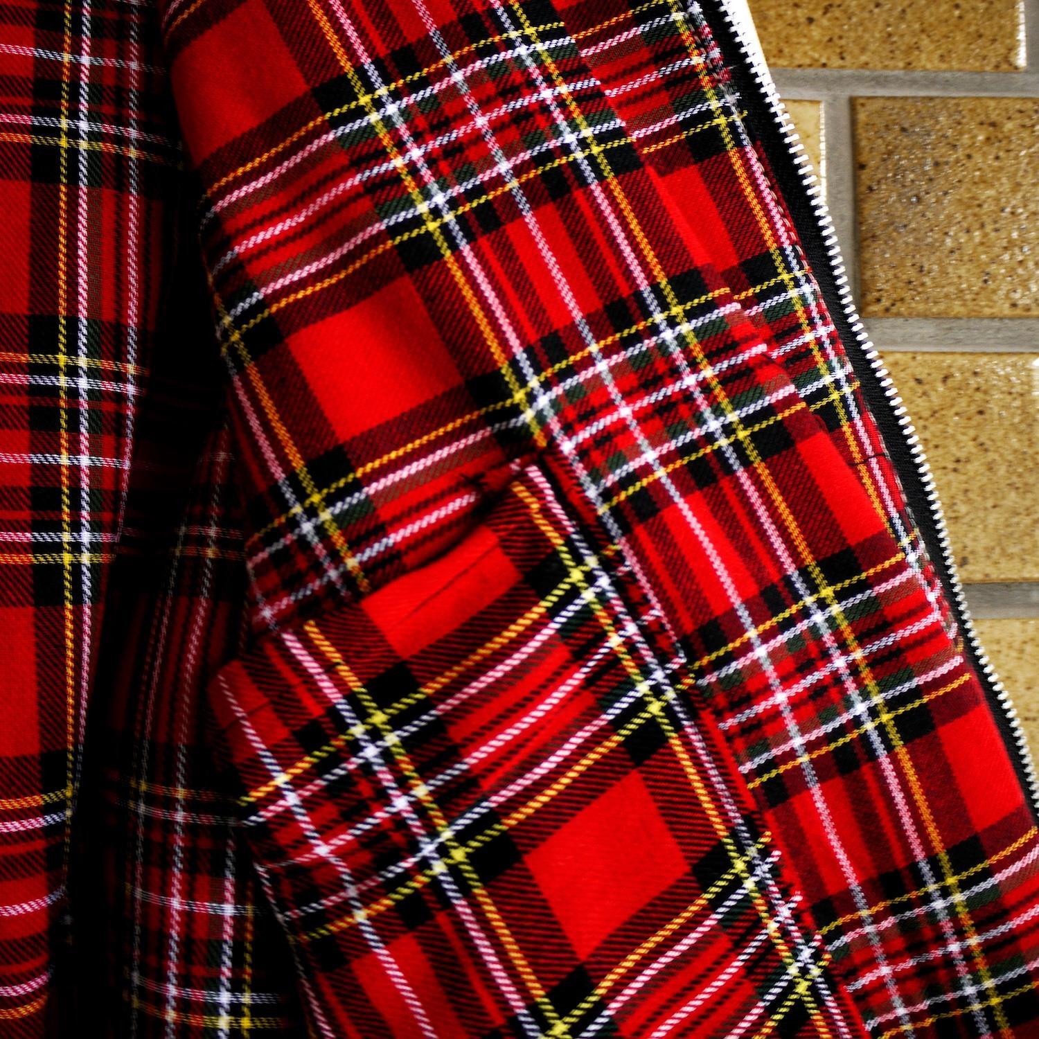 窮屈すぎないリブ周り、赤色を基調としたタータンチェックの裏地が仕様となっています。