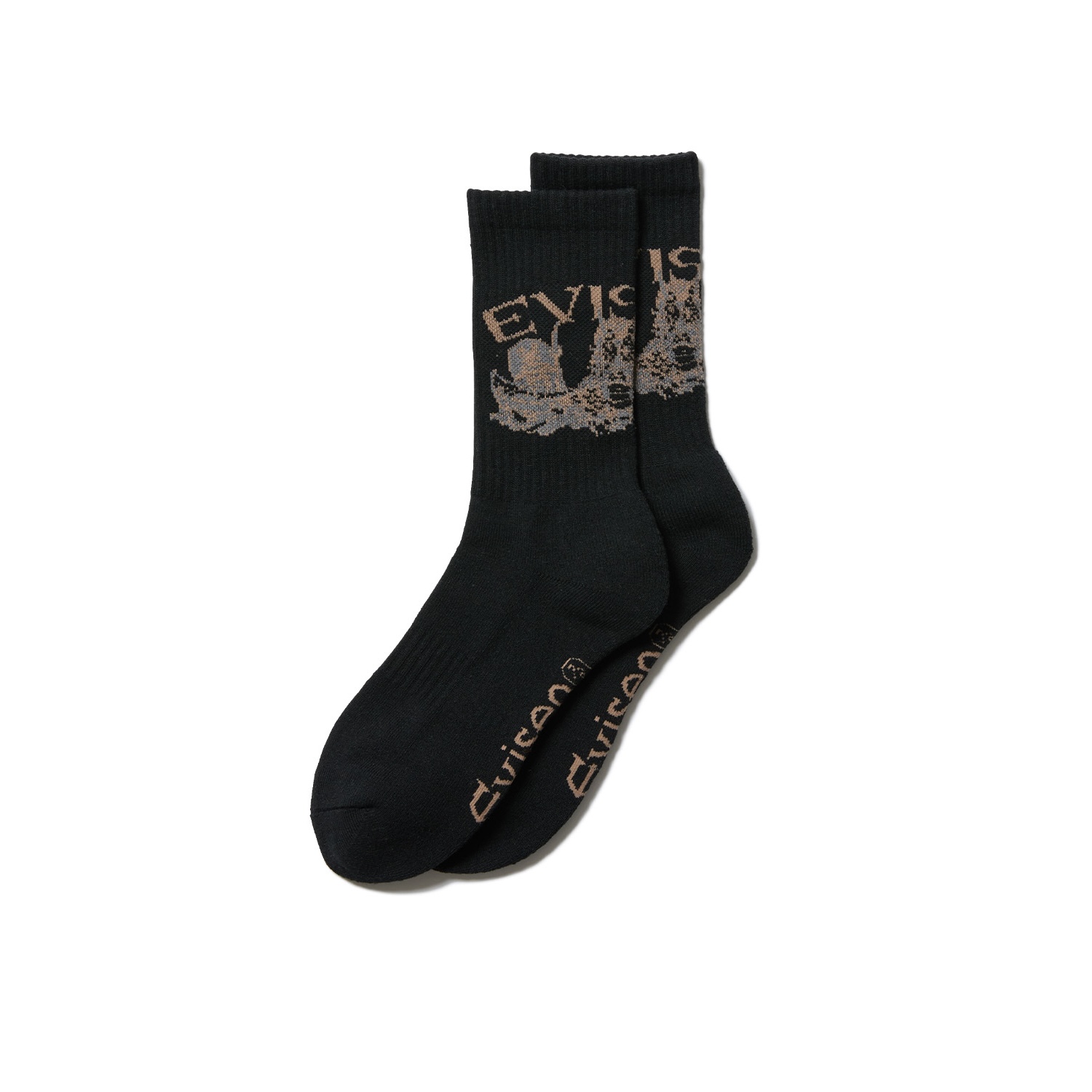 ジャカード編みでDRAGONグラフィックを表現したクルー丈ソックス。
