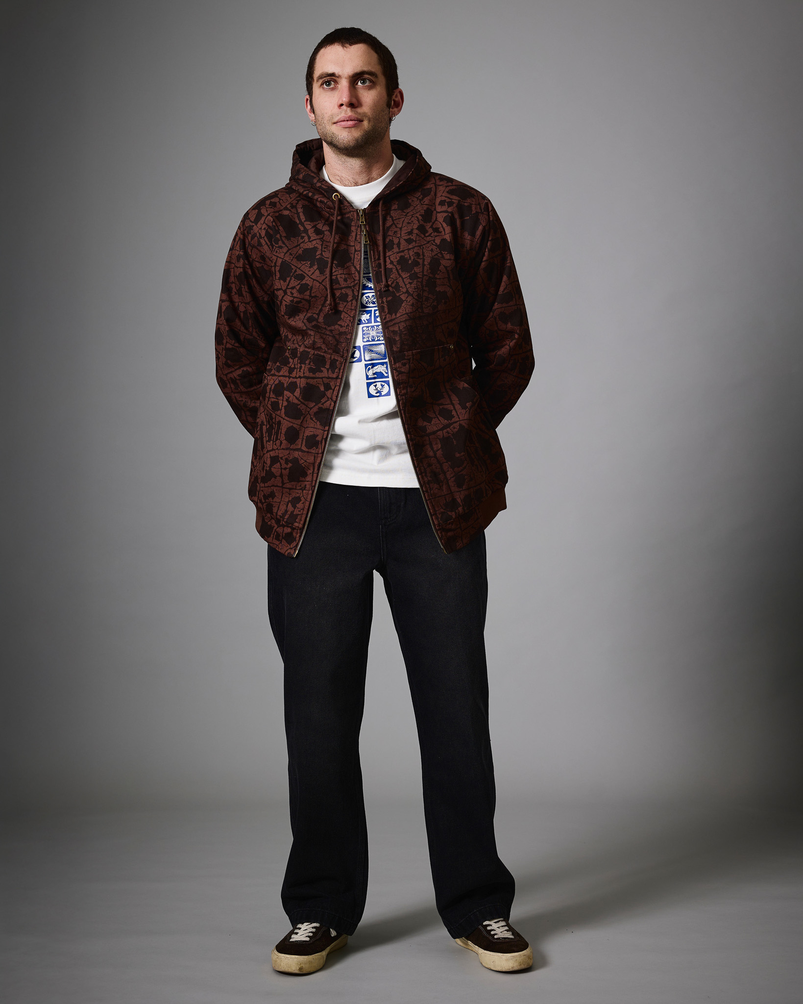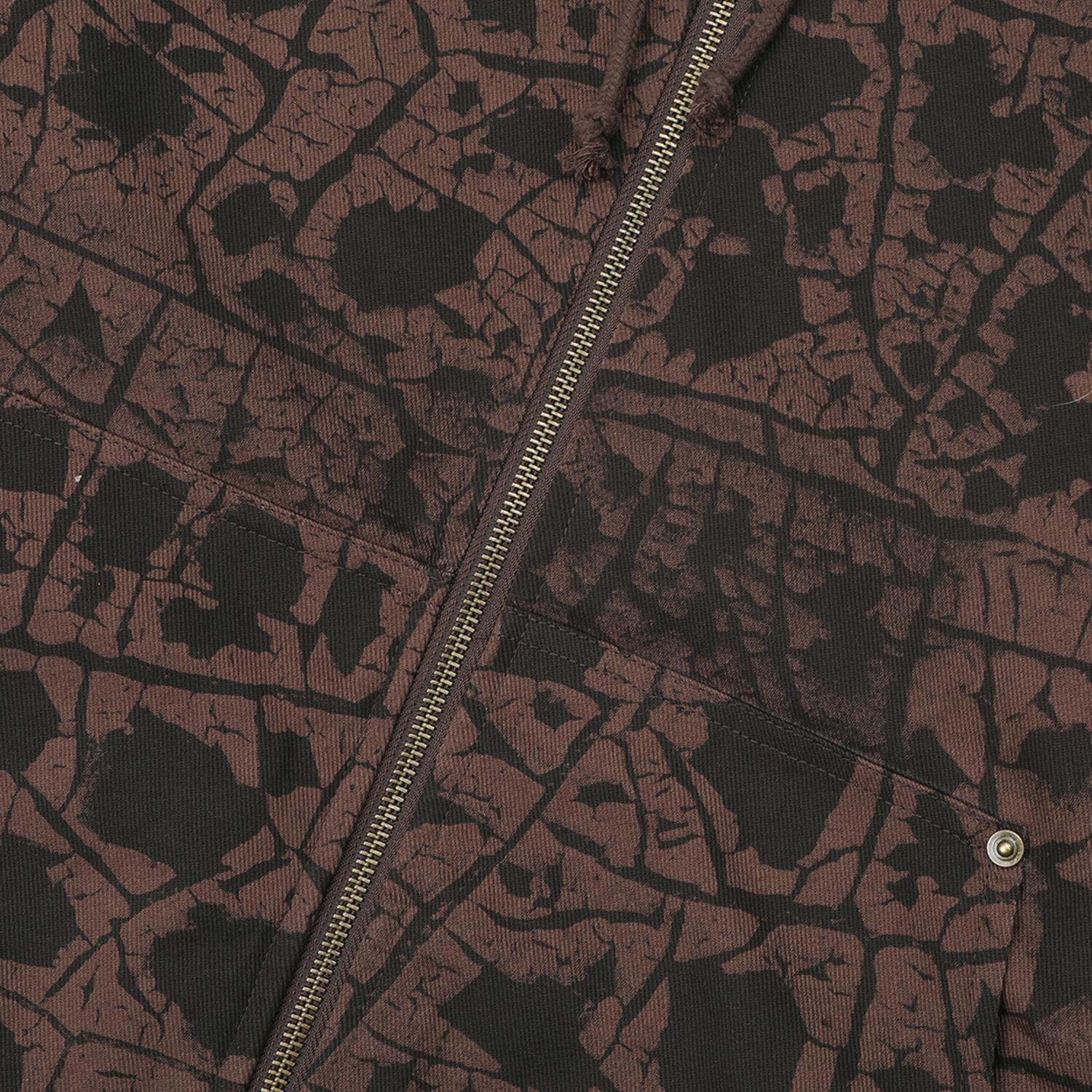 自然風化モチーフパターンが施された中綿仕様のジップフーディー
